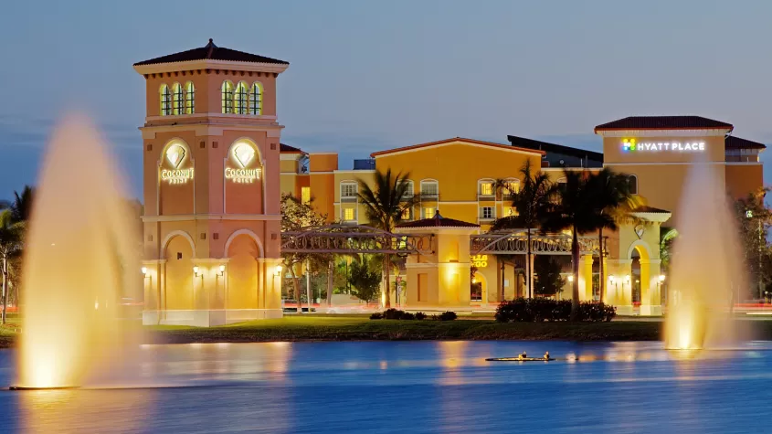 Hyatt Place Coconut Point with sunset in background
