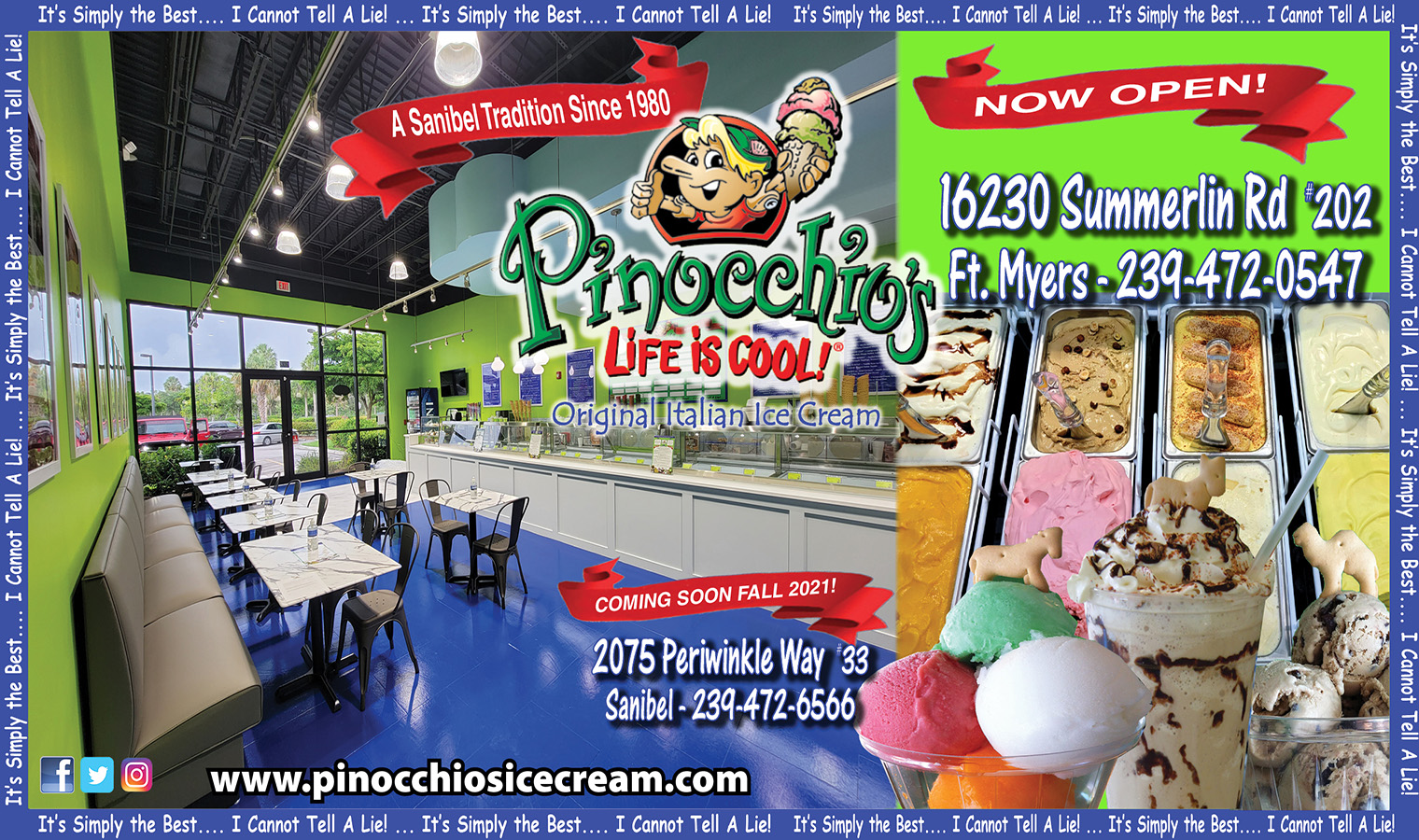 Unique flavors, generous portions and loyal fans describe Pinocchio's Original Italian Ice Cream, a Sanibel tradition since 1980. Home of Pinocchio's Sanibel Krunch, Dirty Sand Dollar, Wedding Bells, Gator Stew and an ever growing repertoire of 200+ flavors, this iconic dessert shop offers a complete line of frozen confections including ice cream, gelato, sorbet, frozen yogurt, sherbet, Italian custard and semifreddo to accompany non-frozen favorites and espresso specialty drinks. We hope you will give us a try and make Pinocchio's your neighborhood's sweet destination. Come in where Life is Cool!