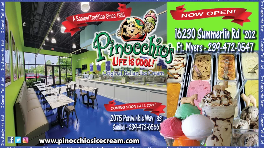 Unique flavors, generous portions and loyal fans describe Pinocchio's Original Italian Ice Cream, a Sanibel tradition since 1980. Home of Pinocchio's Sanibel Krunch, Dirty Sand Dollar, Wedding Bells, Gator Stew and an ever growing repertoire of 200+ flavors, this iconic dessert shop offers a complete line of frozen confections including ice cream, gelato, sorbet, frozen yogurt, sherbet, Italian custard and...